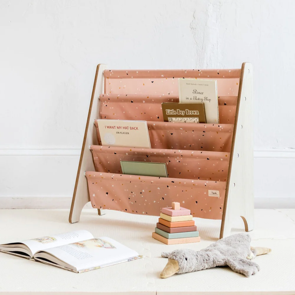 Een mooi boekenrekje met een stijlvol terrazzo motief in clay roze voor de lievelingsboeken van uw kindje. Het boekenrek heeft 4 vakjes voor boeken kinderen kunnen er makkelijk zelf bij om een boekje te pakken.