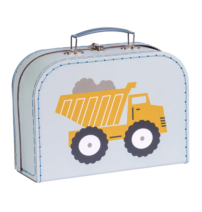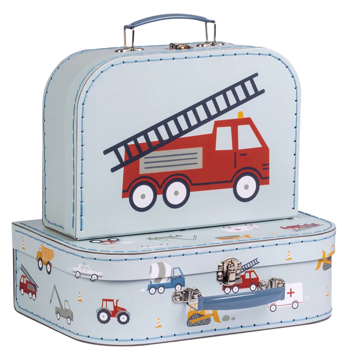 Mooi setje van twee speelgoedkoffers versierd met verschillende soorten voertuigen; decoratief en handig om kleiner speelgoed of knutselspullen in op te bergen.
