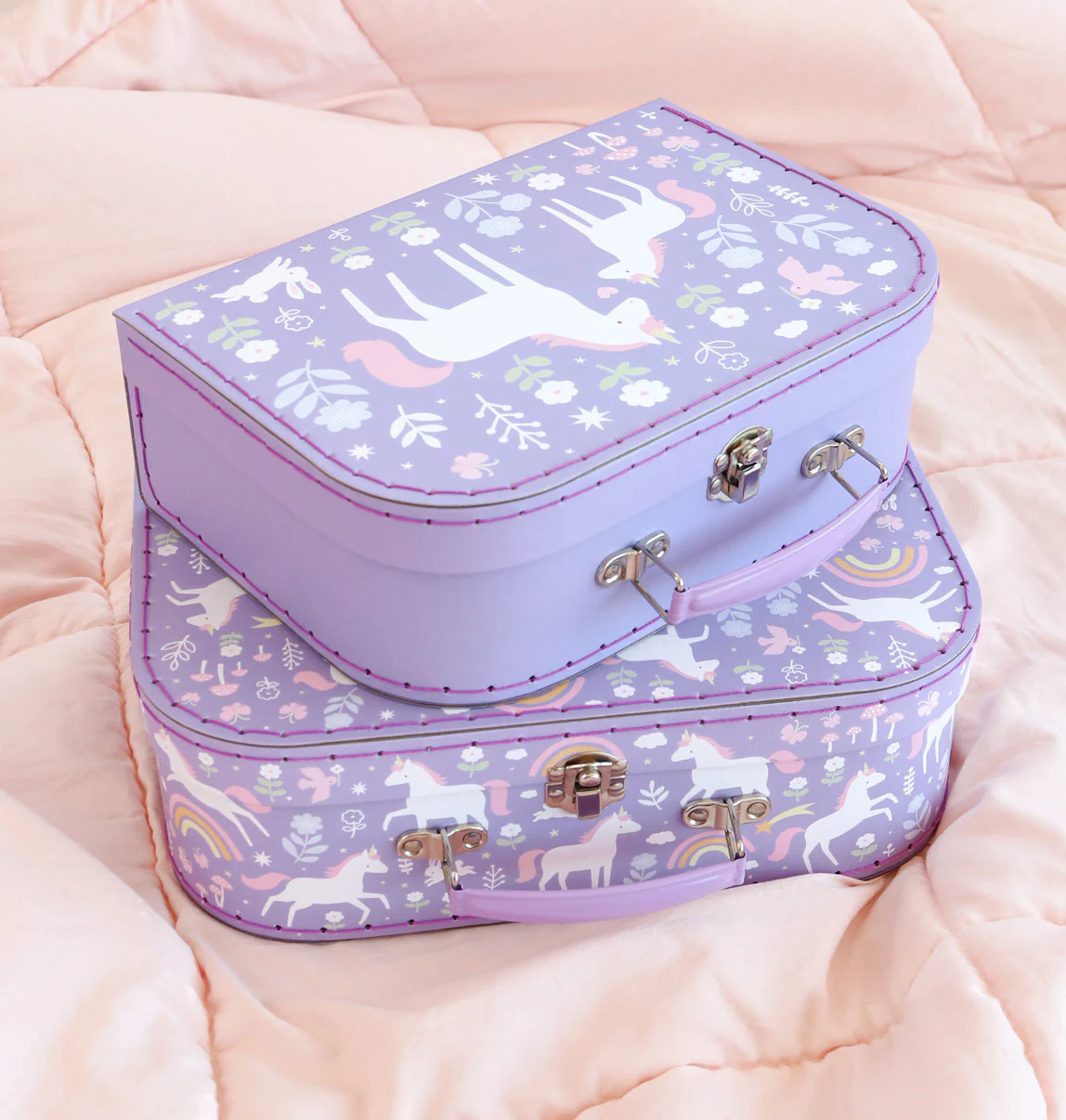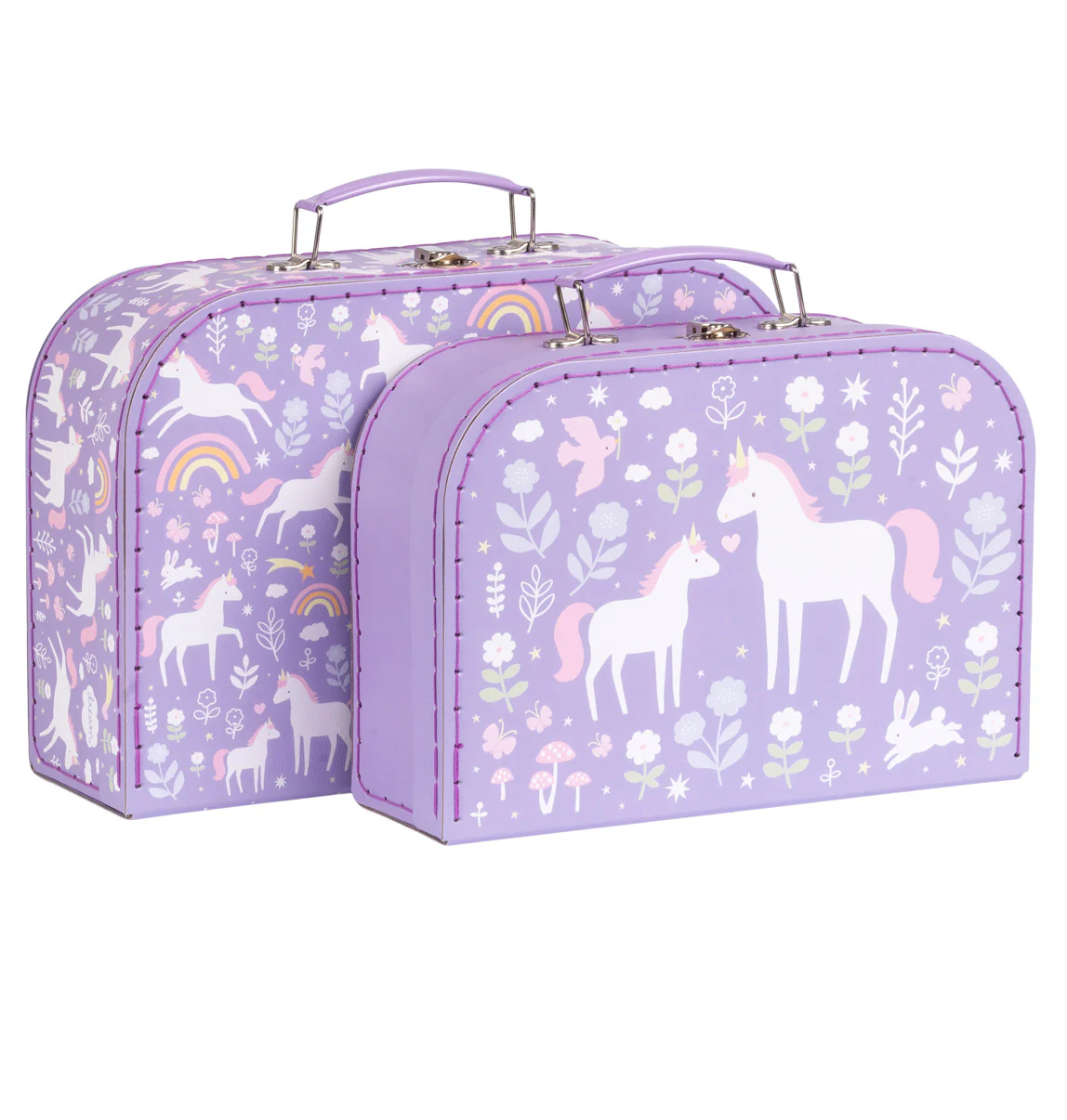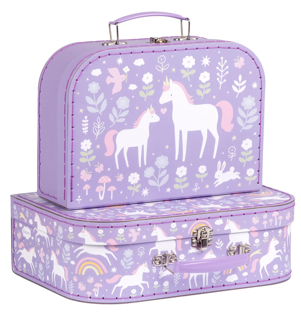Mooi setje van twee speelgoedkoffers met prachtige eenhoorn motiefjes uit de Unicorn Dream collectie van A Lovely Little Company; decoratief en handig om kleiner speelgoed of knutselspullen in op te bergen.