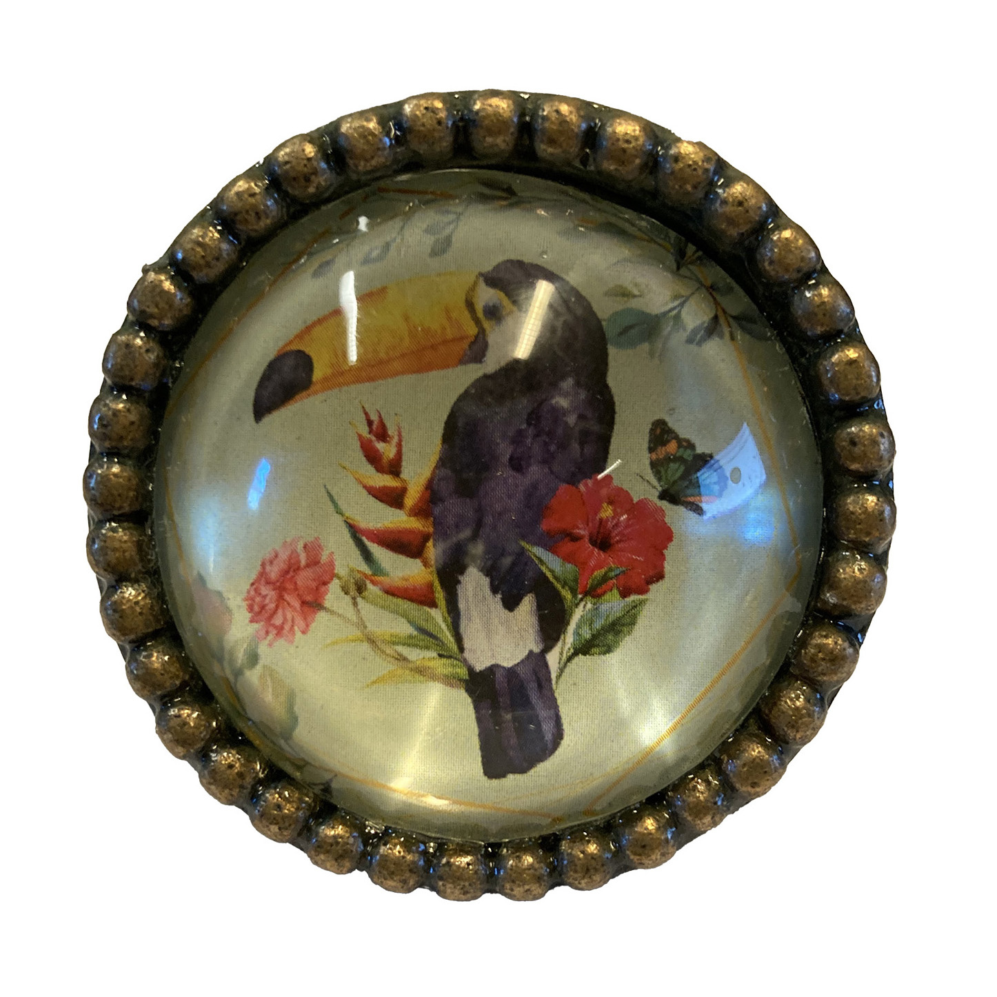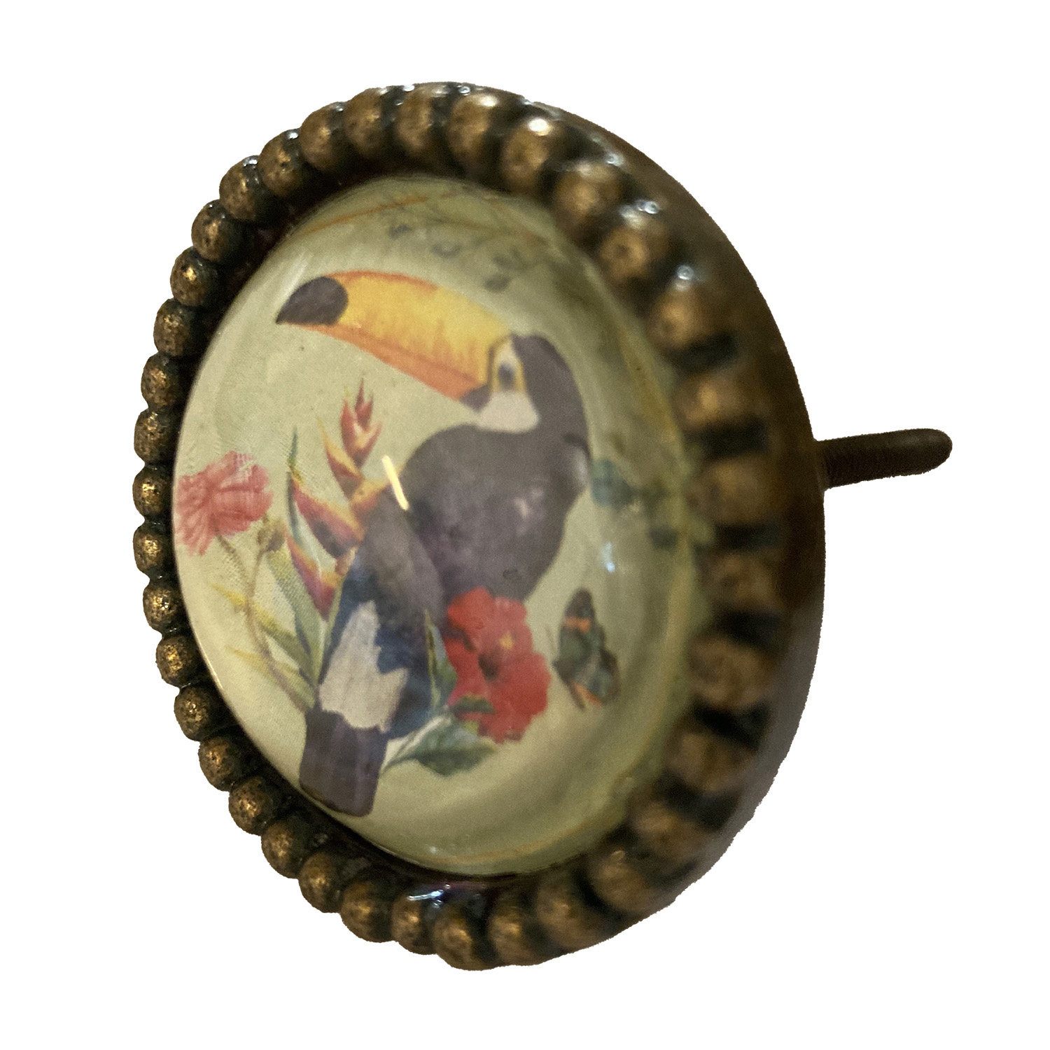Dit stijlvolle, grote kastknopje met een tropische toekan als eye catcher en vintage look geeft de kast of de commode een elegante uitstraling; ook verkrijgbaar in andere mooie vogel motiefjes.