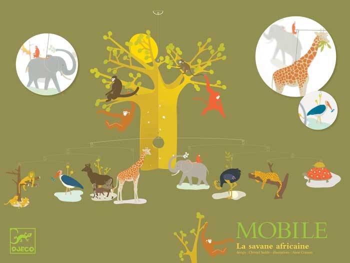 Op deze mooie mobiel van Djeco met zijn grote boom en Afrikaanse dieren raakt je baby niet snel uitgekeken.