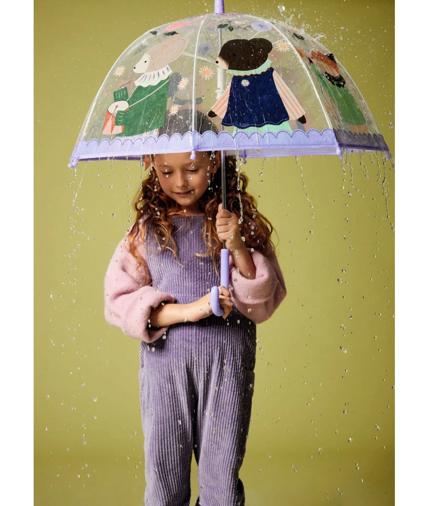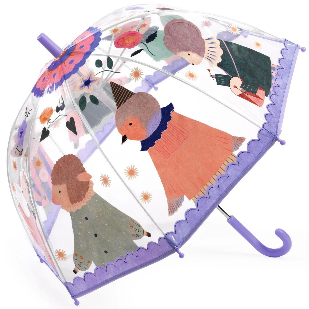 Deze mooie transparante kinderparaplu van Djeco versierd met schattige dieren muzikanten brengt kleur in een regenachtige dag. De paraplu heeft een handmatige opening met beveiligingssysteem, zodat kinderen niet hun vingers kunnen bezeren.