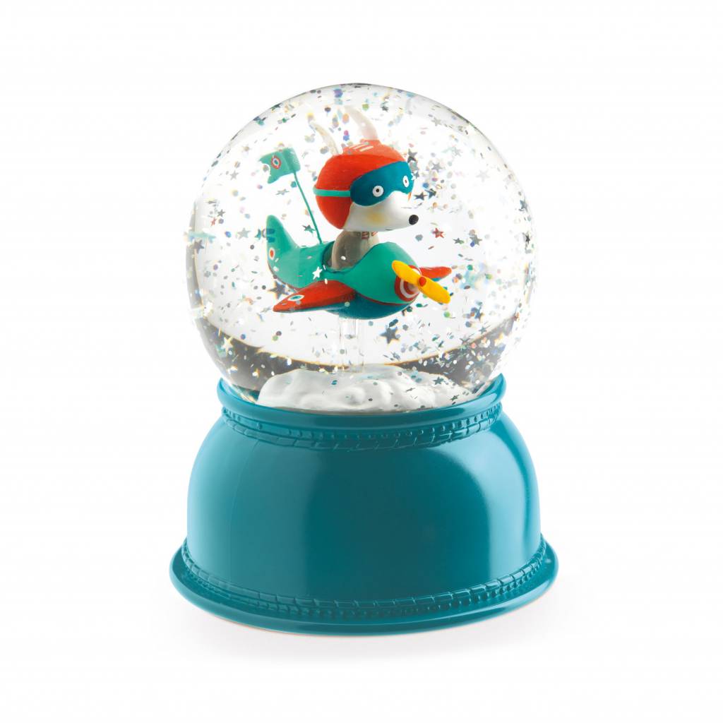Dit magische nachtlampje met een hondje in een stoer vliegtuig is een sneeuwbol en nachtlampje in een. De vlokjes dwarrelen vanzelf heen een weer. Het lampje verandert steeds van kleur, waardoor de vlokjes in verschillende kleuren glinsteren.
