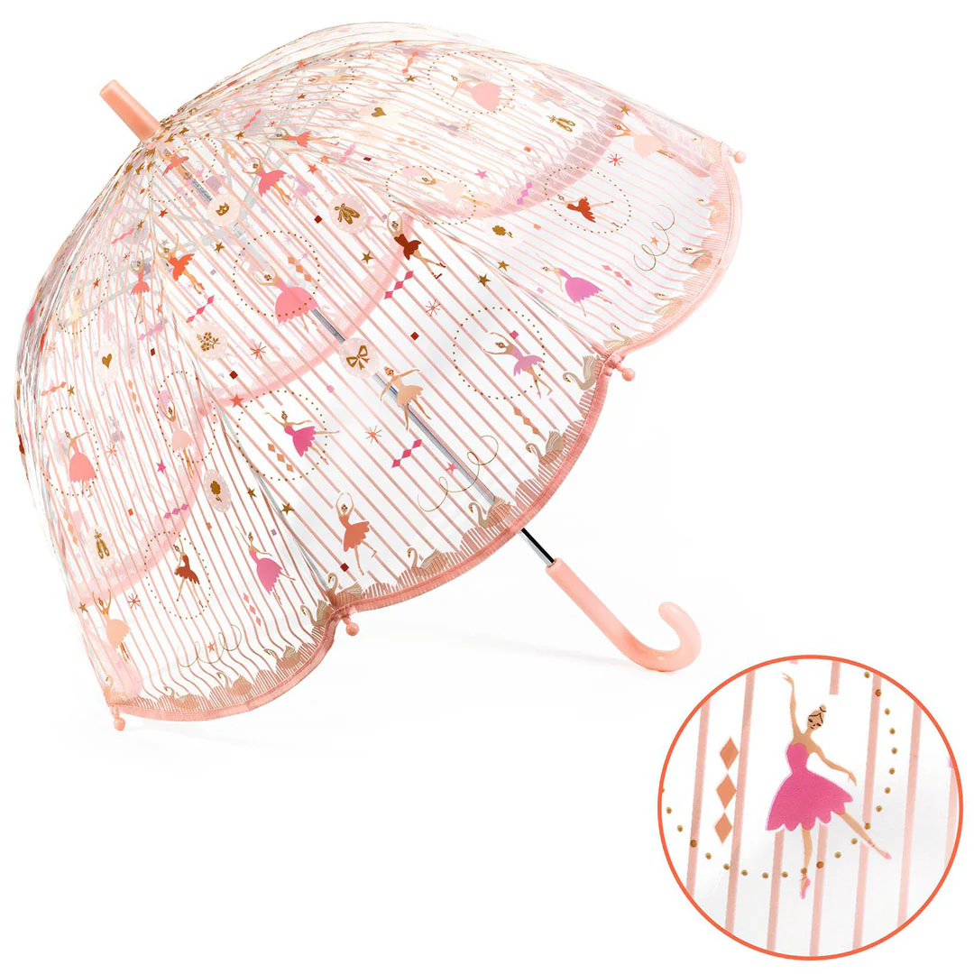 Deze prachtige transparante paraplu van Djeco versierd met gracieuze ballerina's brengt kleur in een regenachtige dag. De paraplu heeft een handmatige opening met beveiligingssysteem, zodat kinderen niet hun vingers kunnen bezeren.