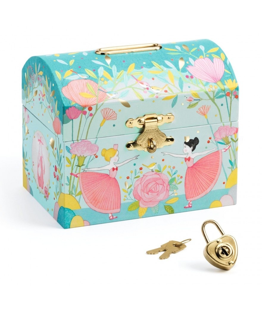 Poëtische spaarpot in de vorm van een schatkist versierd ballerinas en bloemen; handig voor de spaarcentjes en mooi als decoratie voor de meidenkamer.