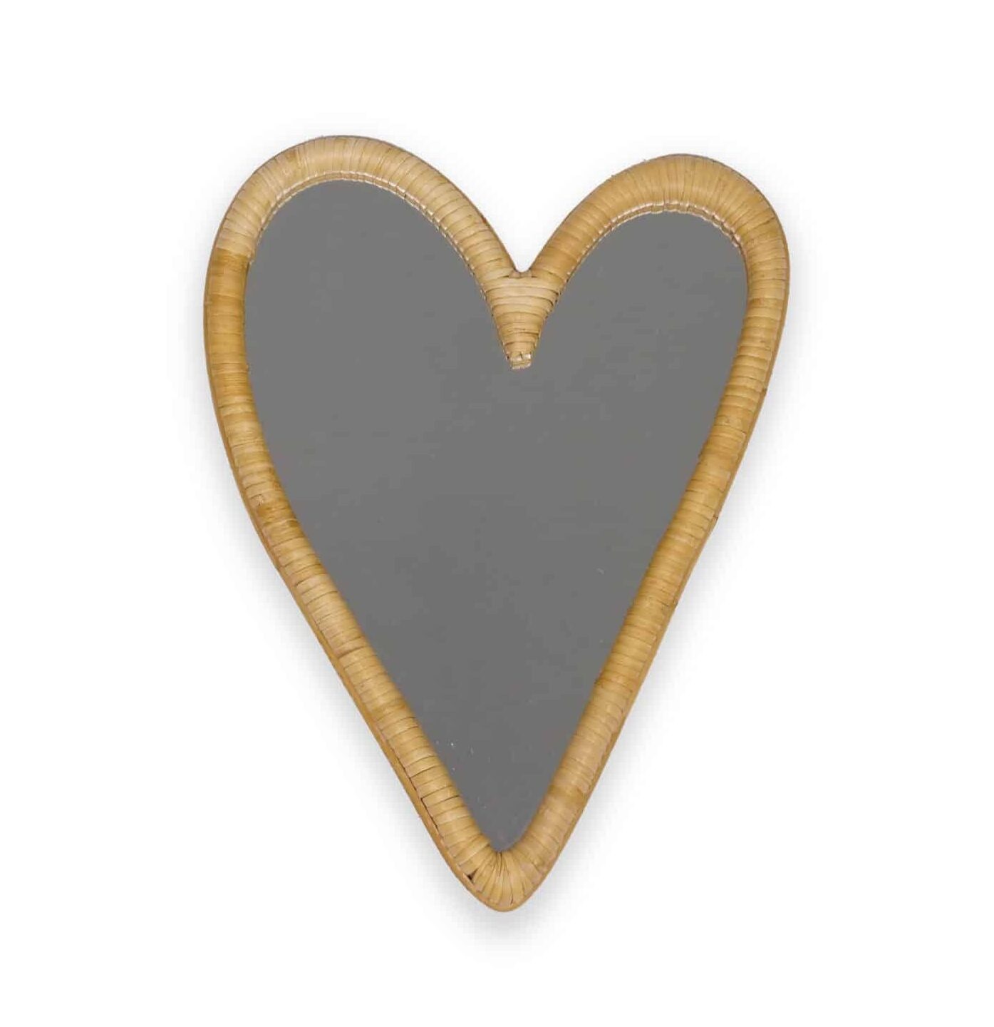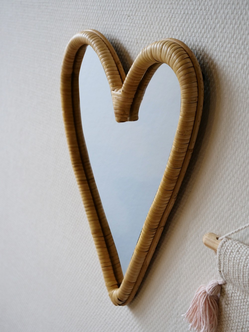 Maak de baby- of kinderkamer nog sfeervoller met deze geweldige rotan spiegel van Kidsdepot in de vorm van een hartje; leuk te combineren met natuurlijke materialen en kleuren en voor een kinderkamer in boho stijl.