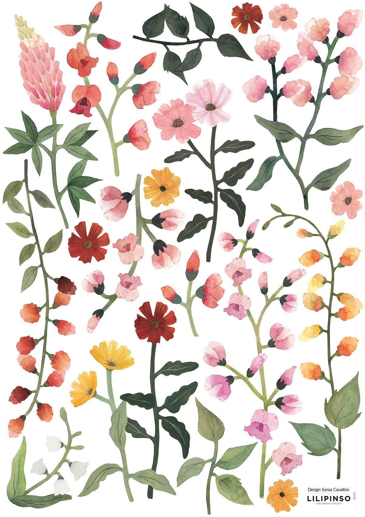 Met deze mooie wildbloemen muursticker in roze rood en geel tinten creëert u een kleurrijke bloementuin in de baby- of kinderkamer. De muurstickers zijn ontworpen door Sonia Cavallini en geven de kinderkamer een vrolijke uitstraling.