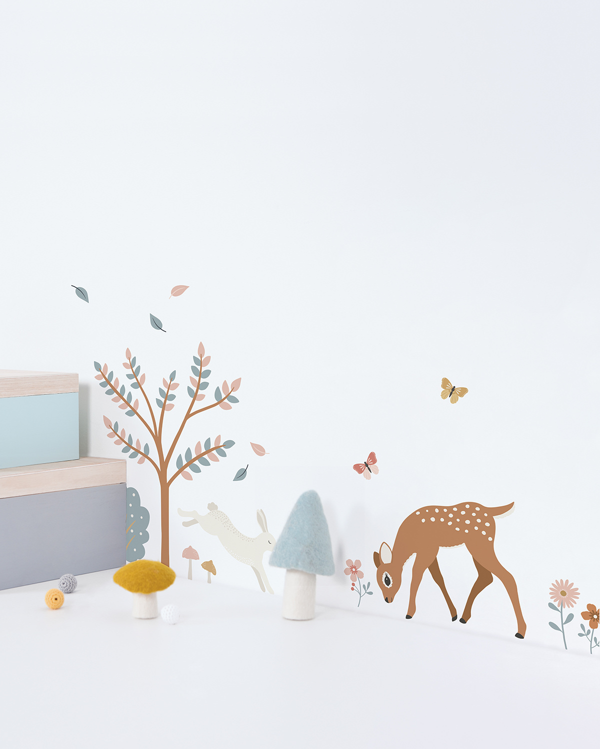 Stijl de baby- of kinderkamer af met deze mooie muursticker van bosdieren, bomen en bloemen; leuk te combineren met de andere muurstickers, posters en het behang uit de Jöro collectie van Lilipinso.