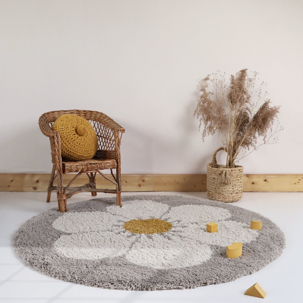 Prachtig rond vloerkleed van Nattiot met een bloem in warm wit als motief; erg mooi voor een kamer met natuurlijke kleuren en voor een bohemian stijl kinderkamer.