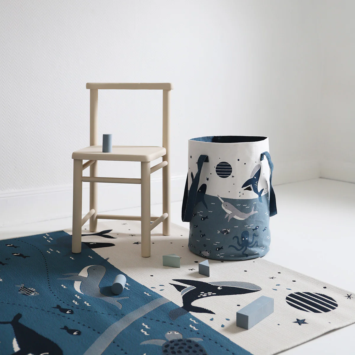 Deze geweldige speelgoedmand van Nattiot versierd met vissen en andere zeedieren is handig om speelgoed in op te bergen en geeft de kinderkamer en mooie blauwe kleuraccent.