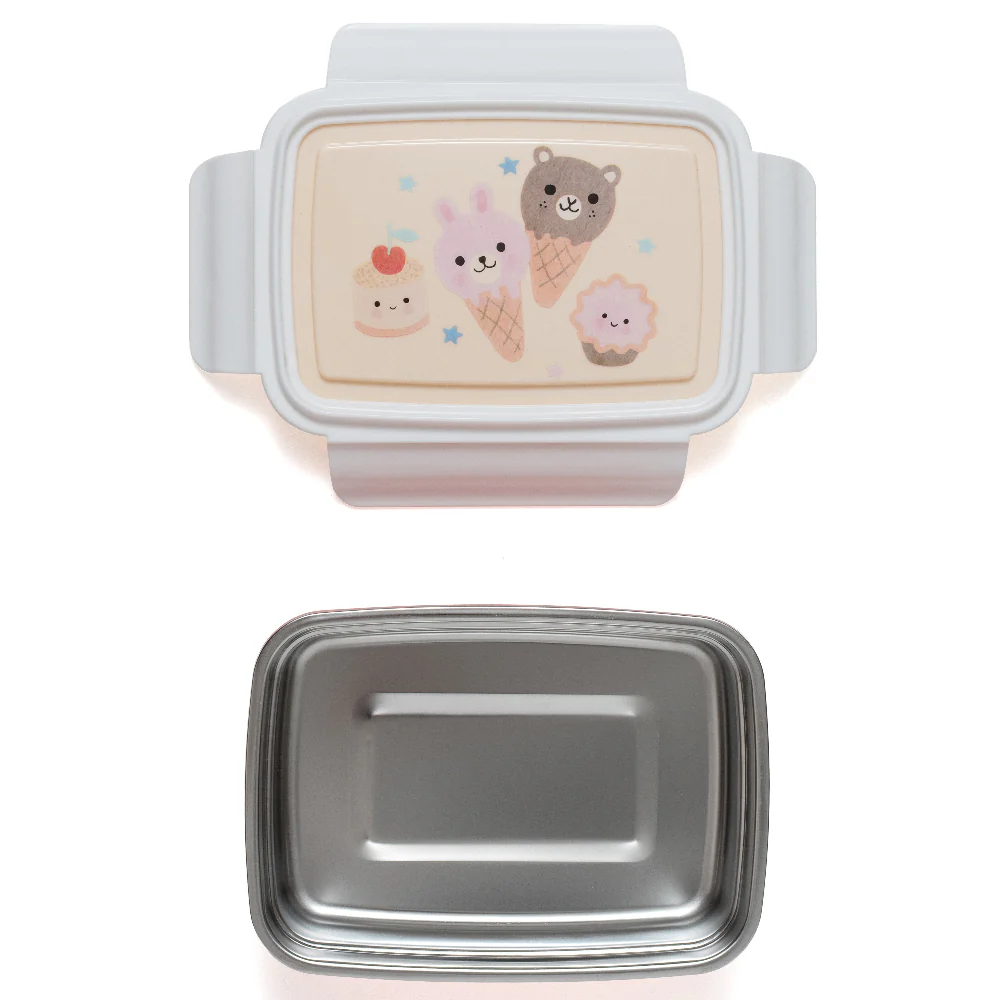 Mooie lunchtrommel van Petit Monkey met deksel voorzien van een handige klik sluiting. De lunchbox is versierd met een schattige fruit motiefjes en heeft een binnenbakje van roestvrij staal.