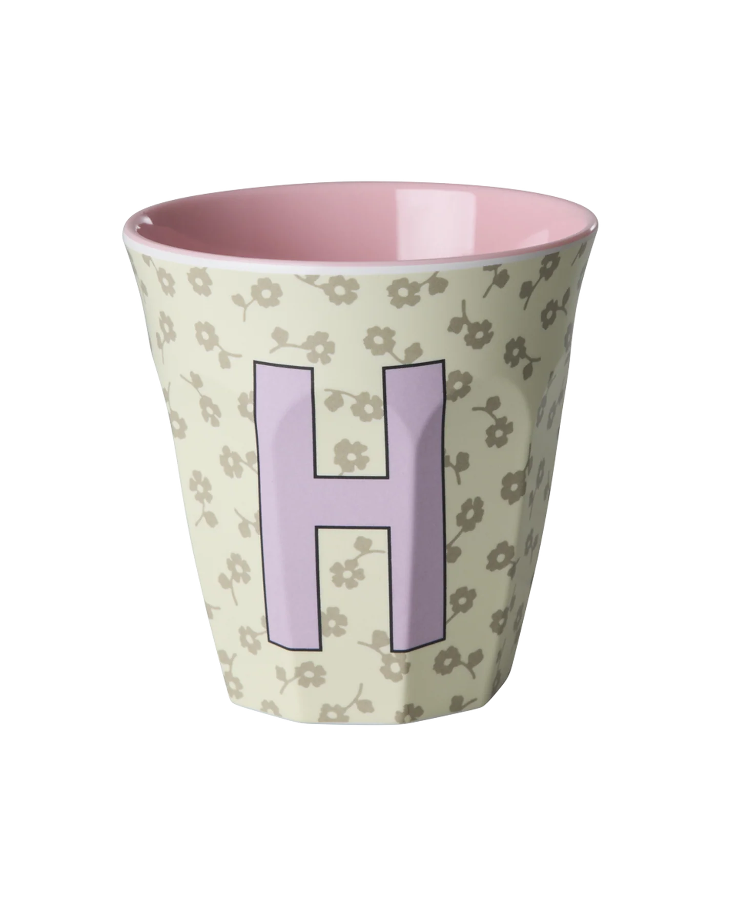 Vrolijke alfabet beker van Rice Denemarken versierd met de letter H en fleurige bloemenmotiefjes. Stevig, licht en ideaal voor dagelijks gebruik, kinderfeestjes, uitjes en picknicks.