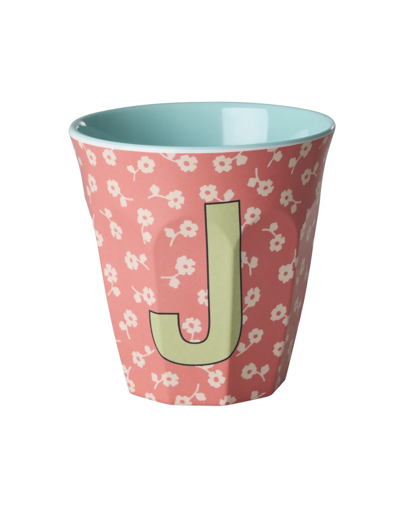Vrolijke alfabet beker van Rice Denemarken versierd met de letter J en fleurige bloemenmotiefjes. Stevig, licht en ideaal voor dagelijks gebruik, kinderfeestjes, uitjes en picknicks.