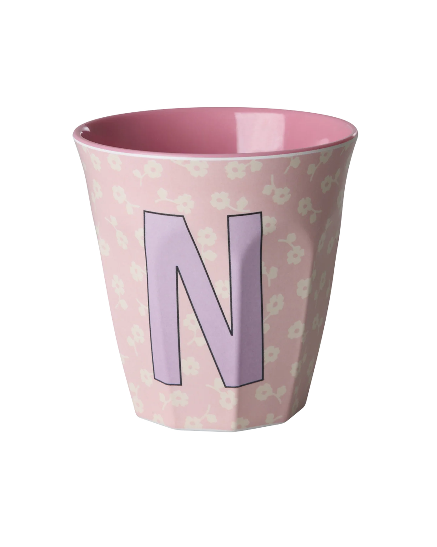Vrolijke alfabet beker van Rice Denemarken versierd met de letter N en fleurige bloemenmotiefjes. Stevig, licht en ideaal voor dagelijks gebruik, kinderfeestjes, uitjes en picknicks.