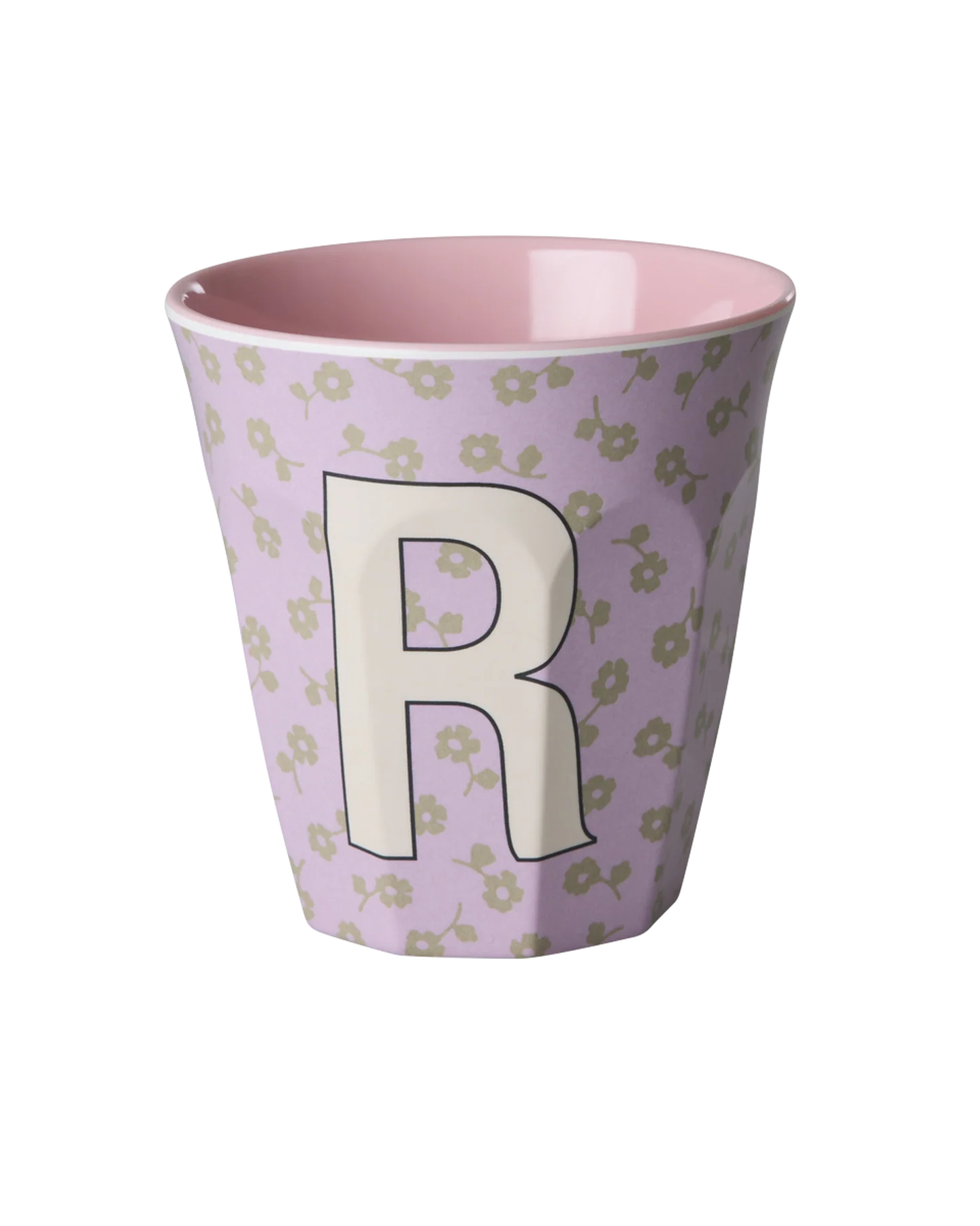 Vrolijke alfabet beker van Rice Denemarken versierd met de letter R en fleurige bloemenmotiefjes. Stevig, licht en ideaal voor dagelijks gebruik, kinderfeestjes, uitjes en picknicks.