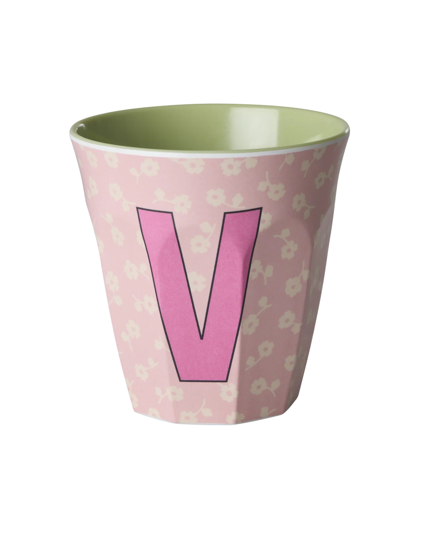Vrolijke alfabet beker van Rice Denemarken versierd met de letter V en fleurige bloemenmotiefjes. Stevig, licht en ideaal voor dagelijks gebruik, kinderfeestjes, uitjes en picknicks.