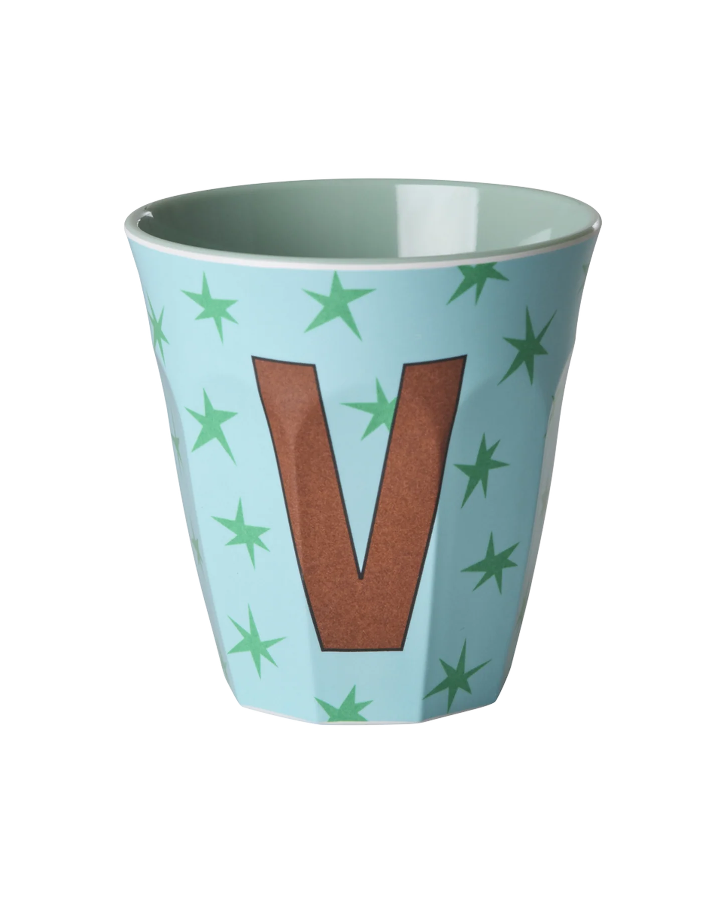 Mooie melamine beker van Rice versierd met de letter V en een sprankelende sterrenprint. Ideaal voor dagelijks gebruik, picknicks of kinderfeestjes. Geef iedereen in het gezin een eigen beker met de beginletter van zijn/haar naam.