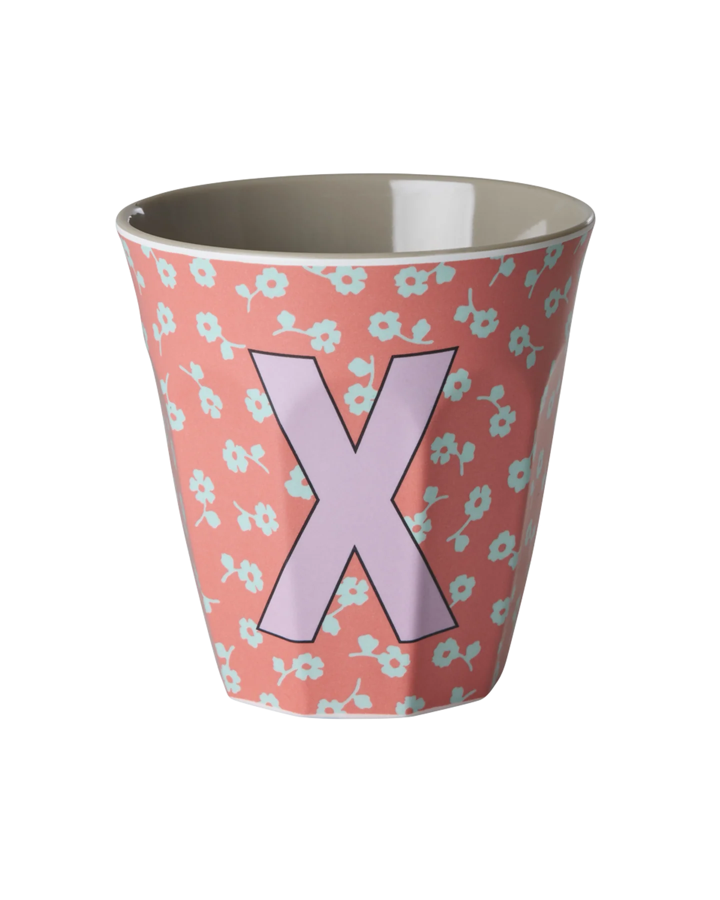 Vrolijke alfabet beker van Rice Denemarken versierd met de letter X en fleurige bloemenmotiefjes. Stevig, licht en ideaal voor dagelijks gebruik, kinderfeestjes, uitjes en picknicks.