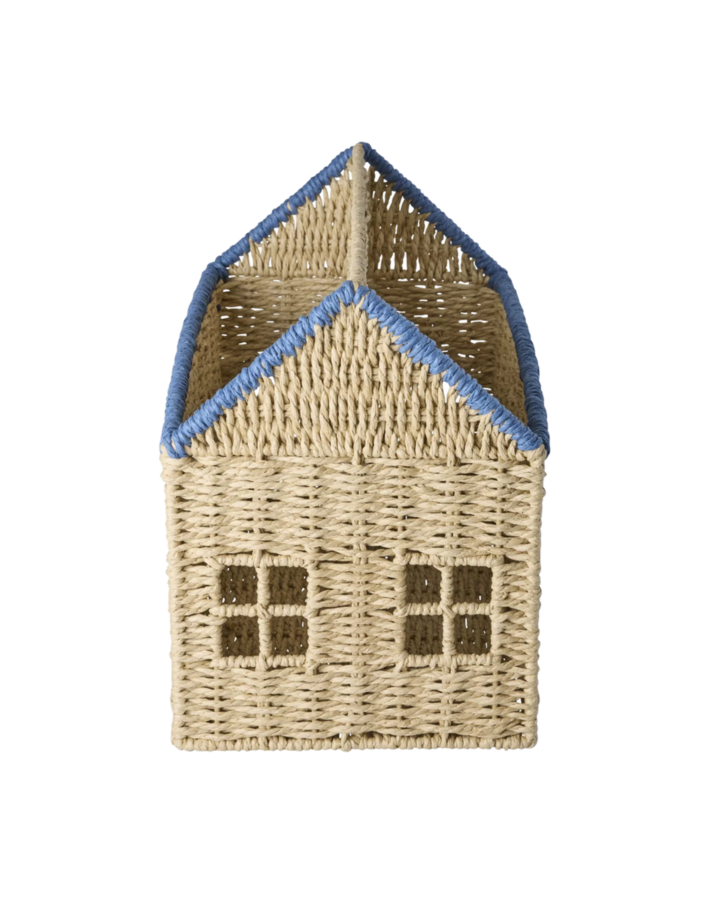 Een speels boekenrekje in de vorm van een huis met blauwe rand. Het open design maakt het ideaal voor het opbergen van boeken, speelgoed of accessoires. Een echte blikvanger voor de kinderkamer of woonkamer.