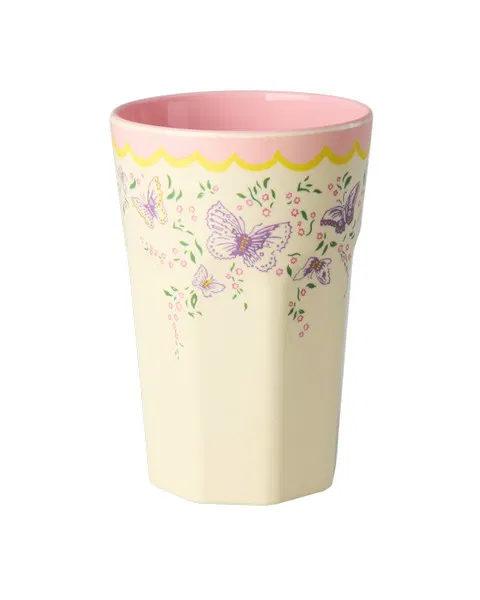 Prachtige hoge beker met romantische vlinder print geïnspireerd op oude vintage servetten met een lichtroze binnenkant; leuk te combineren met andere servies items uit de Glory Days collectie van Rice.