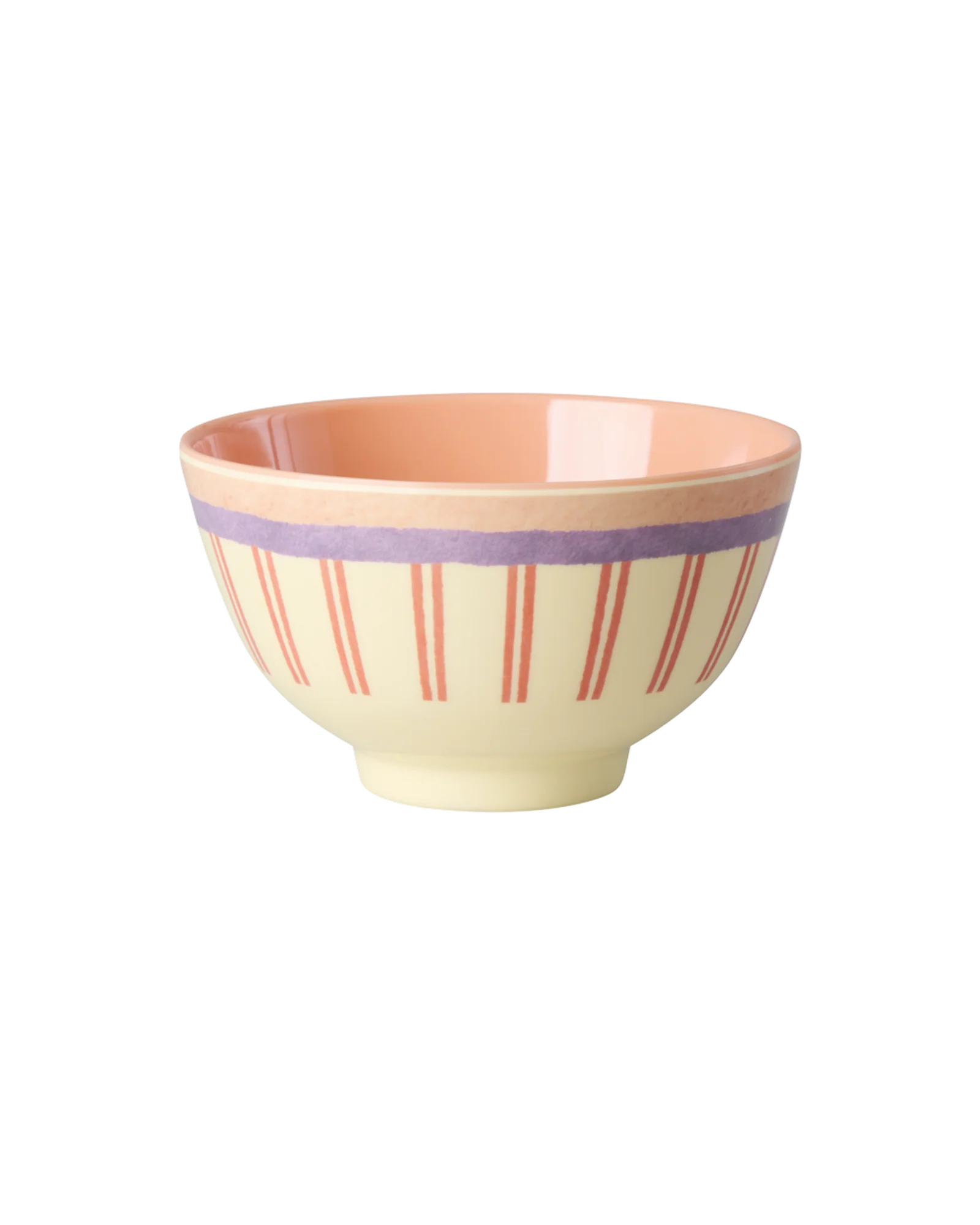 Fleur de eettafel op met deze vrolijke kleine schaaltjes van Rice versierd met kleurrijke strepen en een zalmroze binnenkant; erg leuk te combineren met andere kinderservies items uit de Glory Days collectie van Rice.