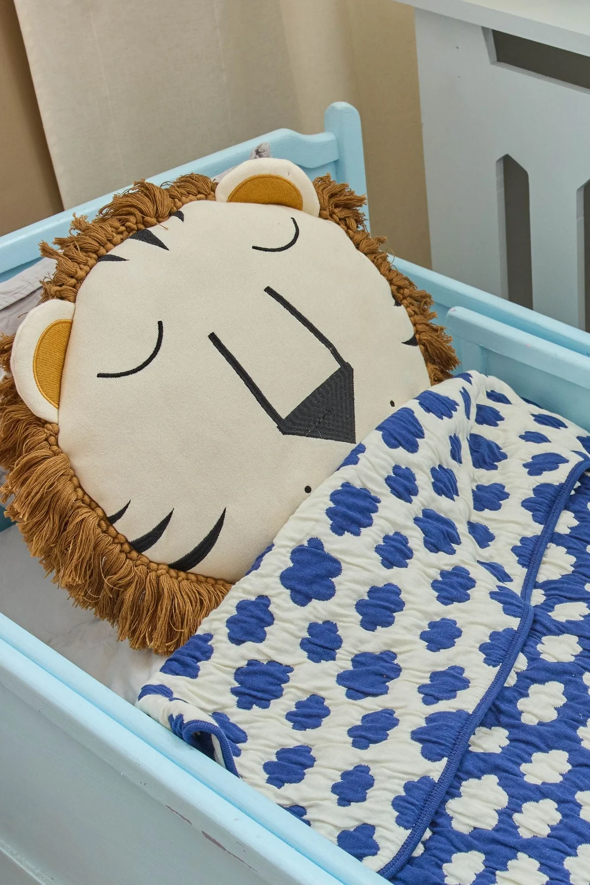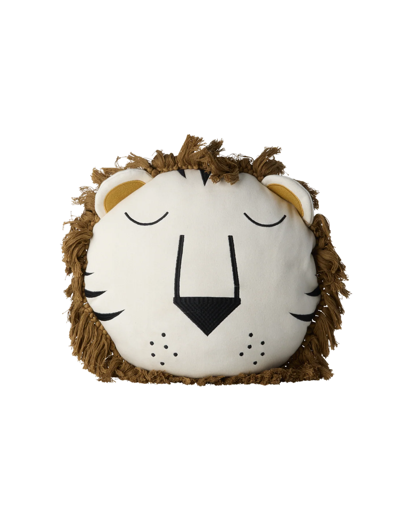 Schattig kussen van Rice in de vorm van een leeuwenkop met bruin manen, zacht en knuffelbaar; ideaal voor de kinderkamer, speelkamer of als speels accent op het kinderbed of een stoel. Het kussen brengt kleur en gezelligheid in de baby- of kinderkamer.