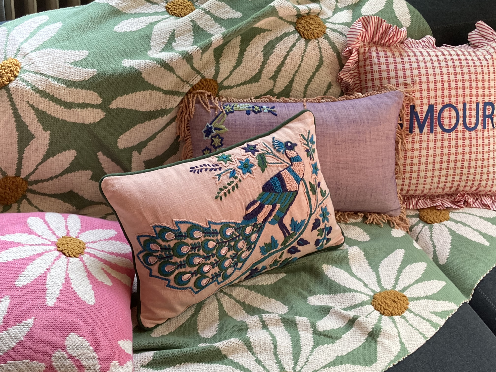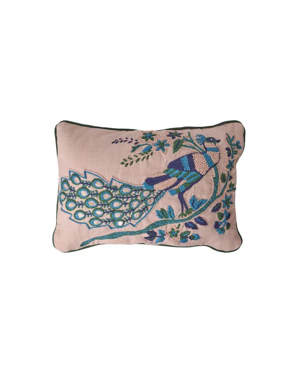 Dit prachtige kussen van het Deense merk Rice is een echte blikvanger voor de kinderkamer of de woonkamer. Het kussen is voorzien van een gedetailleerde, geborduurde pauw die schittert tussen kleurrijke bloemen.