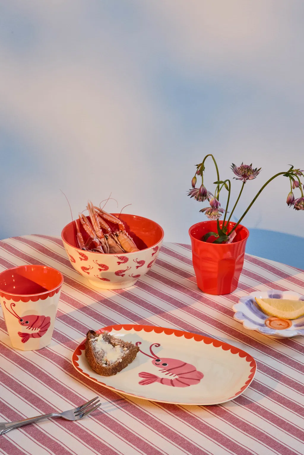 Een vrolijke melamine beker versierd met een schattige garnaal en een licht oranje binnenkant uit de geweldige High Summer collectie van Rice ideaal voor de lunch of een zomers picknick.