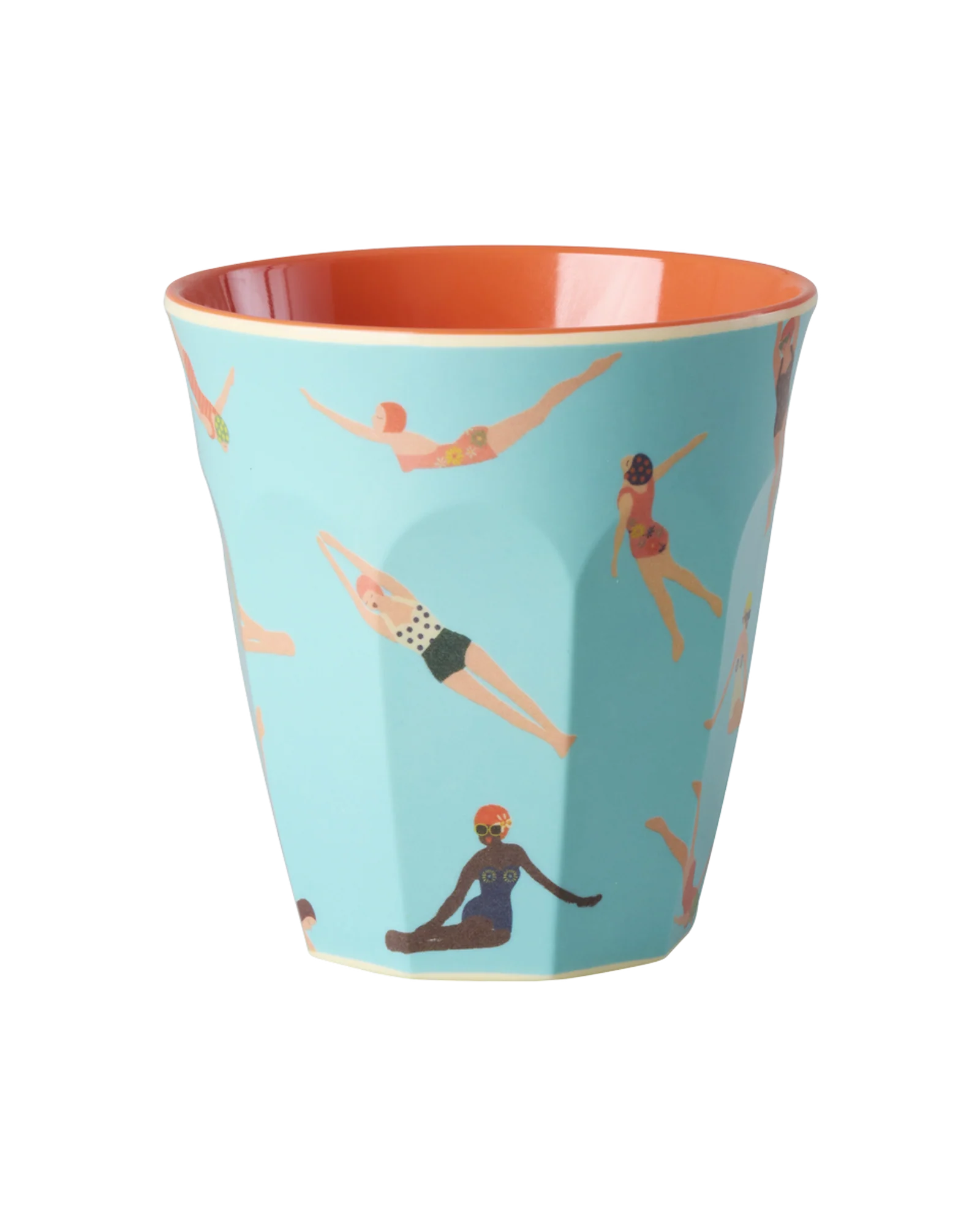 Mooie melamine beker van Rice Denemarken versierd met een vrolijke retro zwemster print; ook een erg leuk cadeautje voor het behalen van het zwemdiploma.