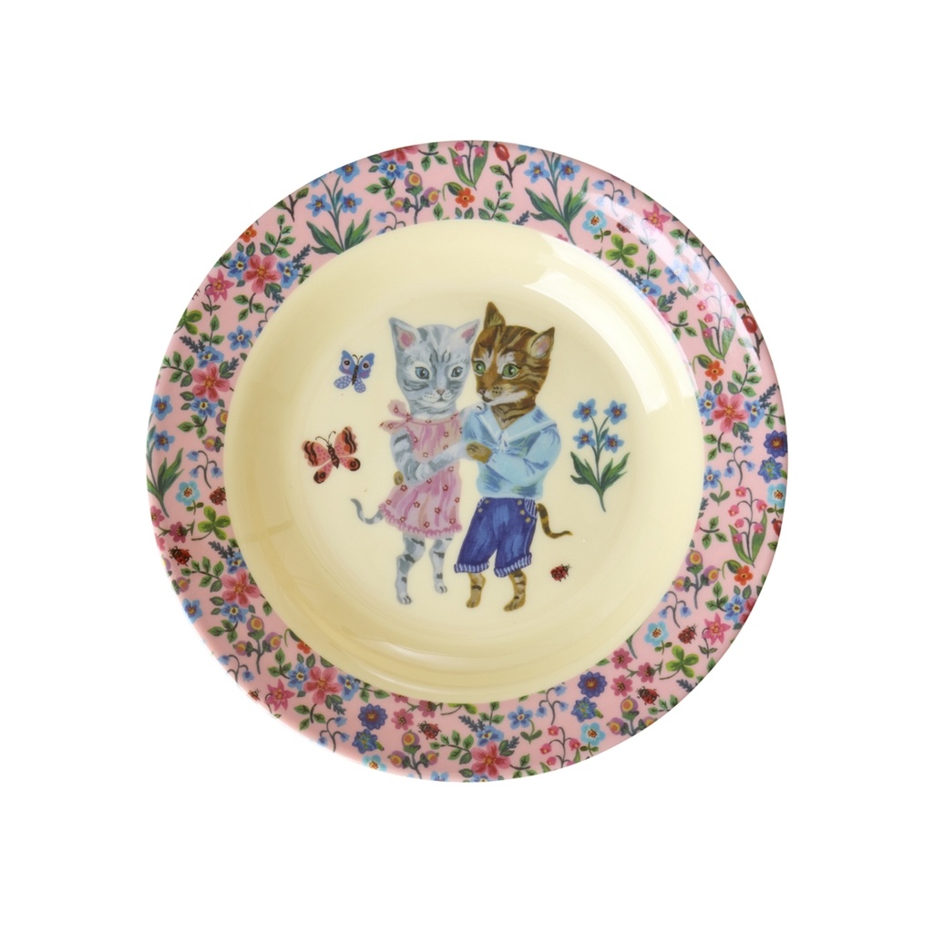 Mooi diep kinderbordje in uit de Nathalie Lété melamine collectie van Rice versierd met schattige poesjes in vintage stijl een een kleurrijke bloemen rand, erg leuk te combineren met andere kinderservies items uit deze serie.