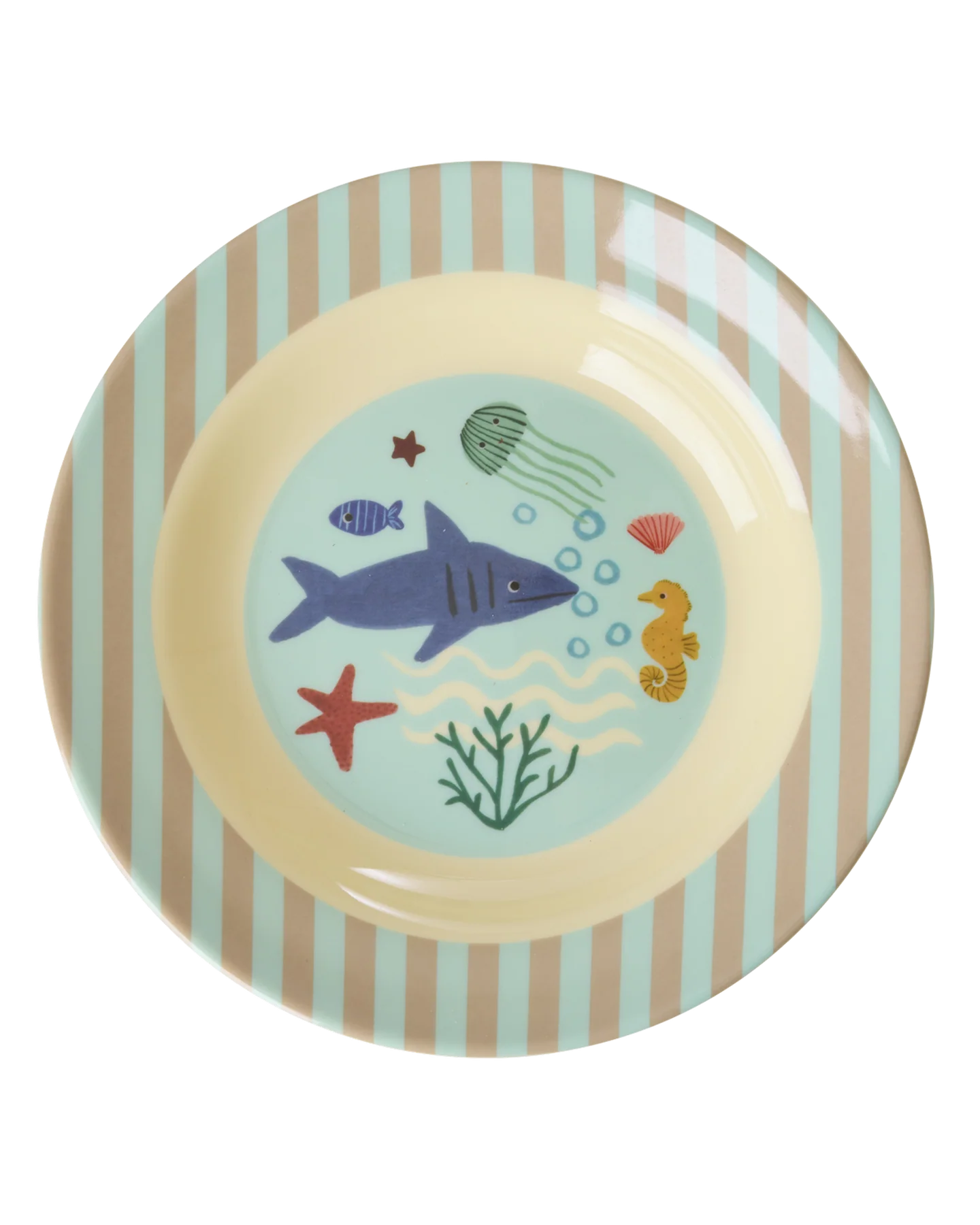 Vrolijk diep kinderbord van uit de Ocean collectie Rice met een versierd met een stoere haai en andere schattige zeedieren, een zomers zee-thema en een speelse gestreepte rand. Perfect voor pap of snacks!