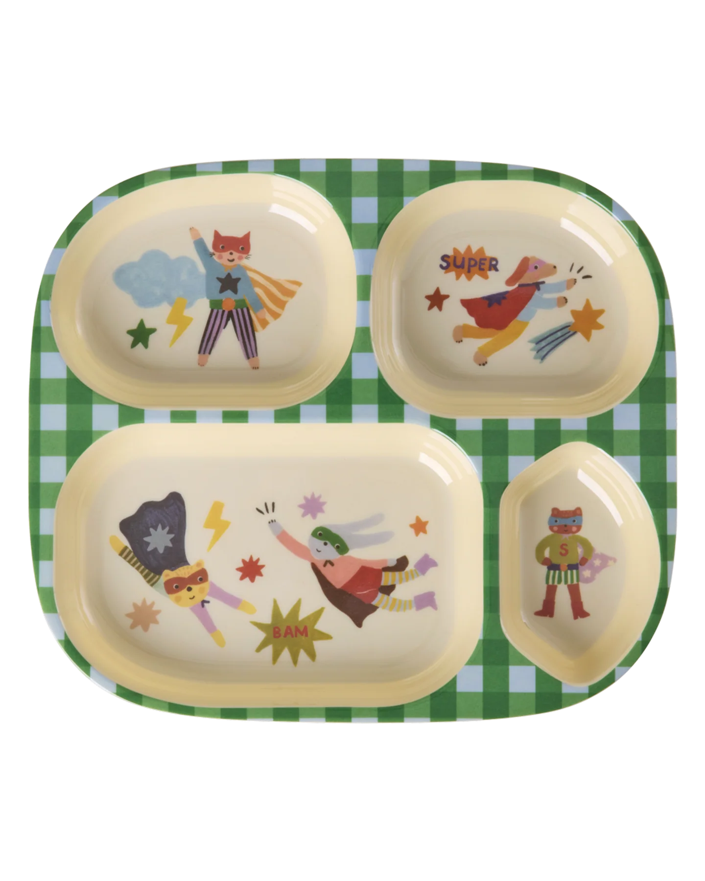 Mooi kinderbord versierd met fantasievolle superhelden motiefjes en vier handige compartimenten; leuk te combineren met de andere kinderservies items uit de Hero kinderservies collectie van Rice.