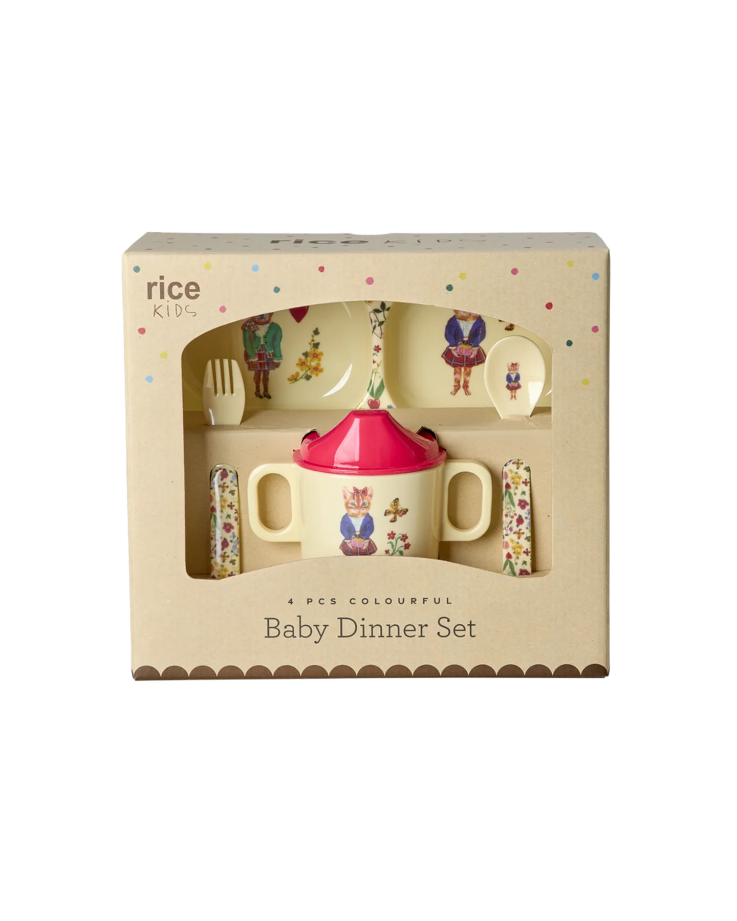 - Dit kinderservies bestaat uit een bordje en tuitbeker en een babybestekje