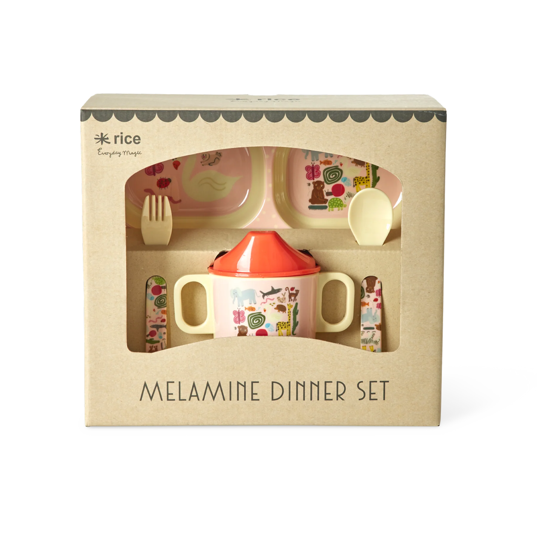 Prachtig kinderservies bestaand uit een kinderbord een tuitbeker en een bestekje. Het servies is versierd met schattige dieren en is leuk te combineren met de schaaltjes en bekers uit de Wildlife collectie van Rice.