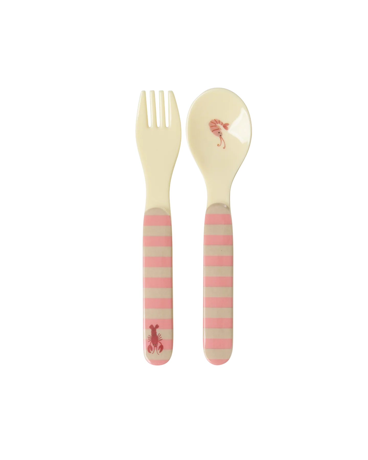 Maak elke maaltijd een klein avontuur met dit mooie kinderbestek van Rice! Dit charmante setje bestaat uit een vork en een lepel, versierd met kleurrijke strepen en een speels motiefje van een kreeft en garnaal. Perfect op maat gemaakt voor kleine handjes