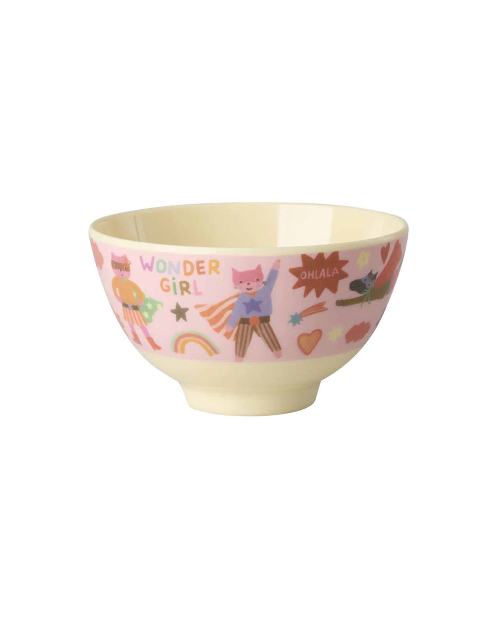 Fantasievol klein melamine schaaltje uit de Hero collectie van Rice versierd superhelden dieren, ook verkrijgbaar in creme. Het bakje is leuk te combineren met de kinderbekers en bordjes uit deze serie.