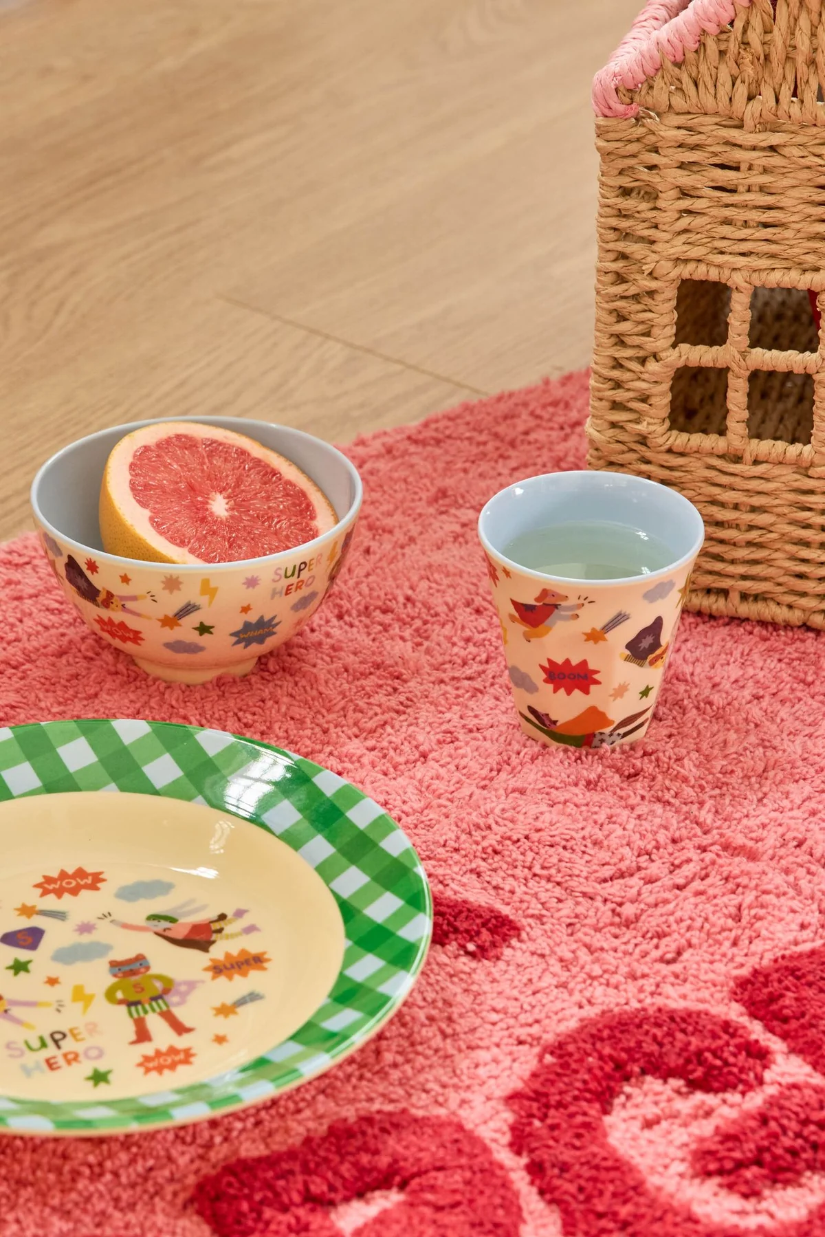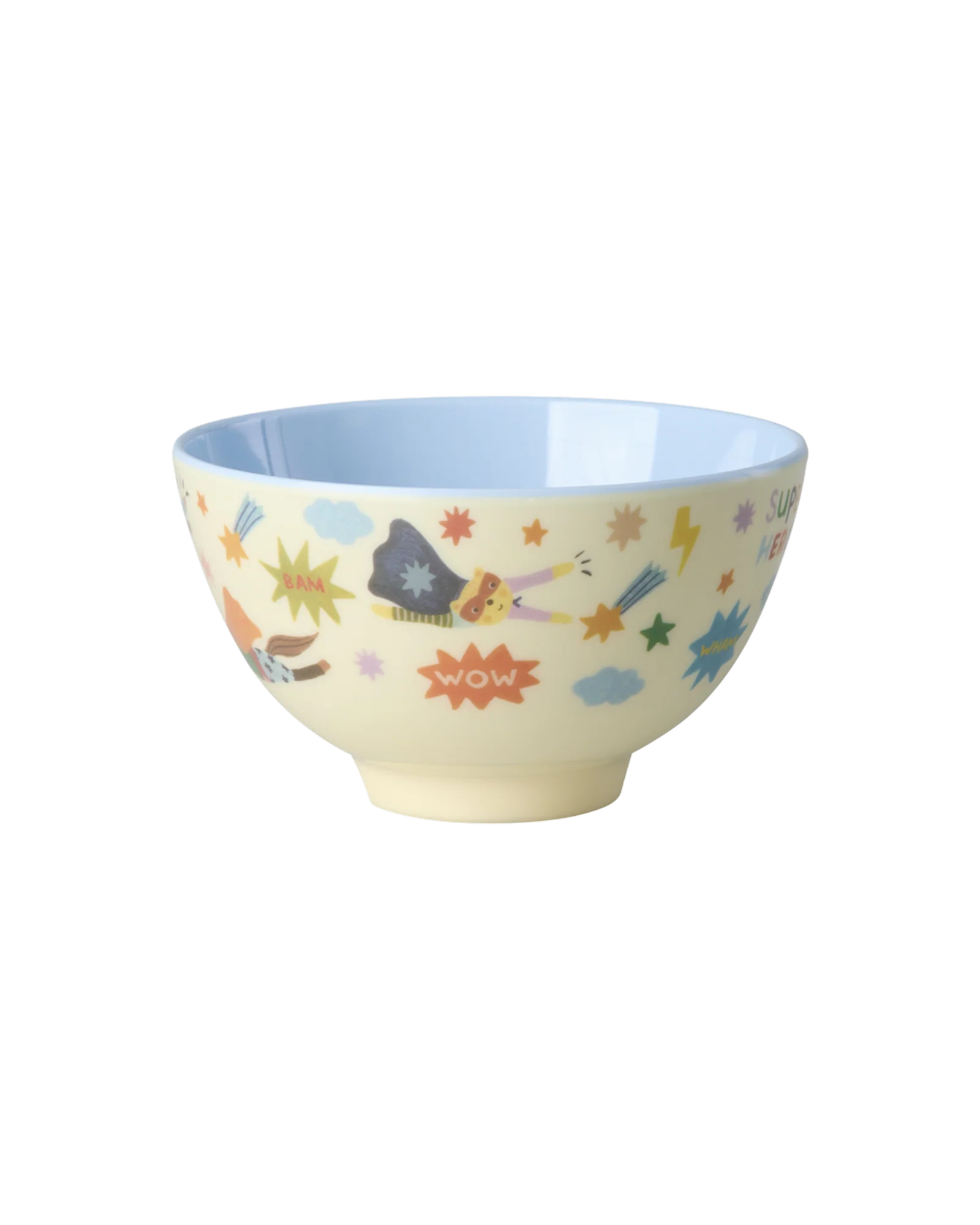 Fantasievol klein melamine schaaltje uit de Hero collectie van Rice versierd superhelden dieren, ook verkrijgbaar in roze. Het bakje is leuk te combineren met de kinderbekers en bordjes uit deze serie.