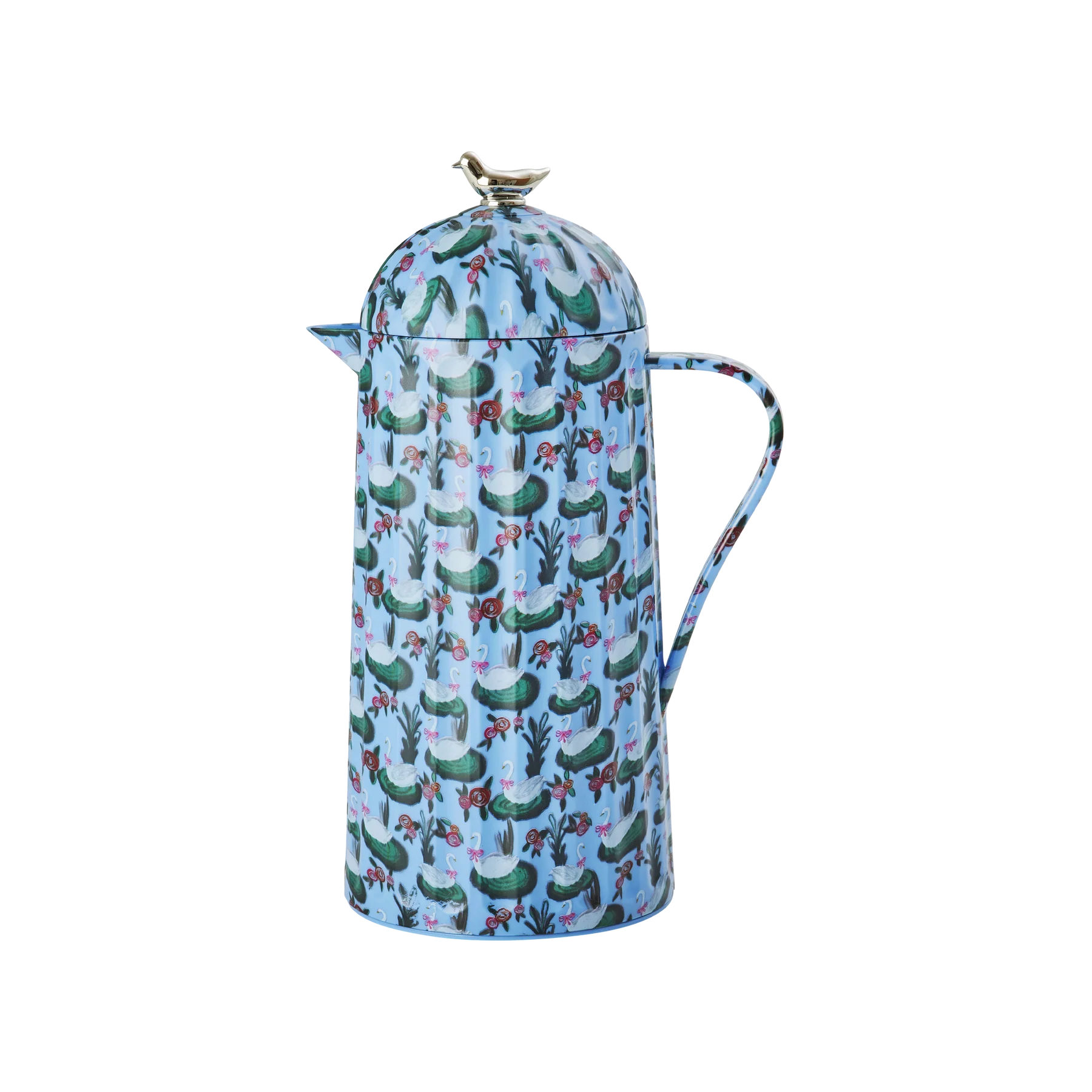 Prachtige thermoskan in blauw versierd met zwanen en met een schattig zilveren vogeltje erop, die drankjes tot 12 uur warm houdt; handig voor een feestje, picknick of een camping trip.