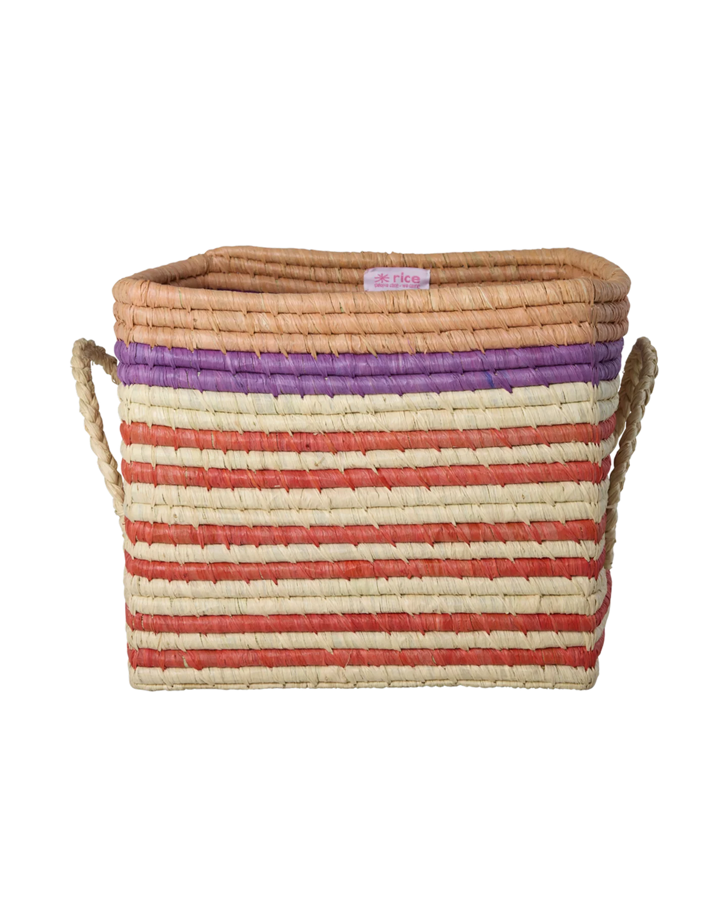 Vrolijk de kinderkamer of de woonkamer op met deze geweldige opbergmand met kleurrijke strepen in de kleuren van de Glory Days collectie van Rice; perfect voor het opbergen van speelgoed, knuffels of boeken.