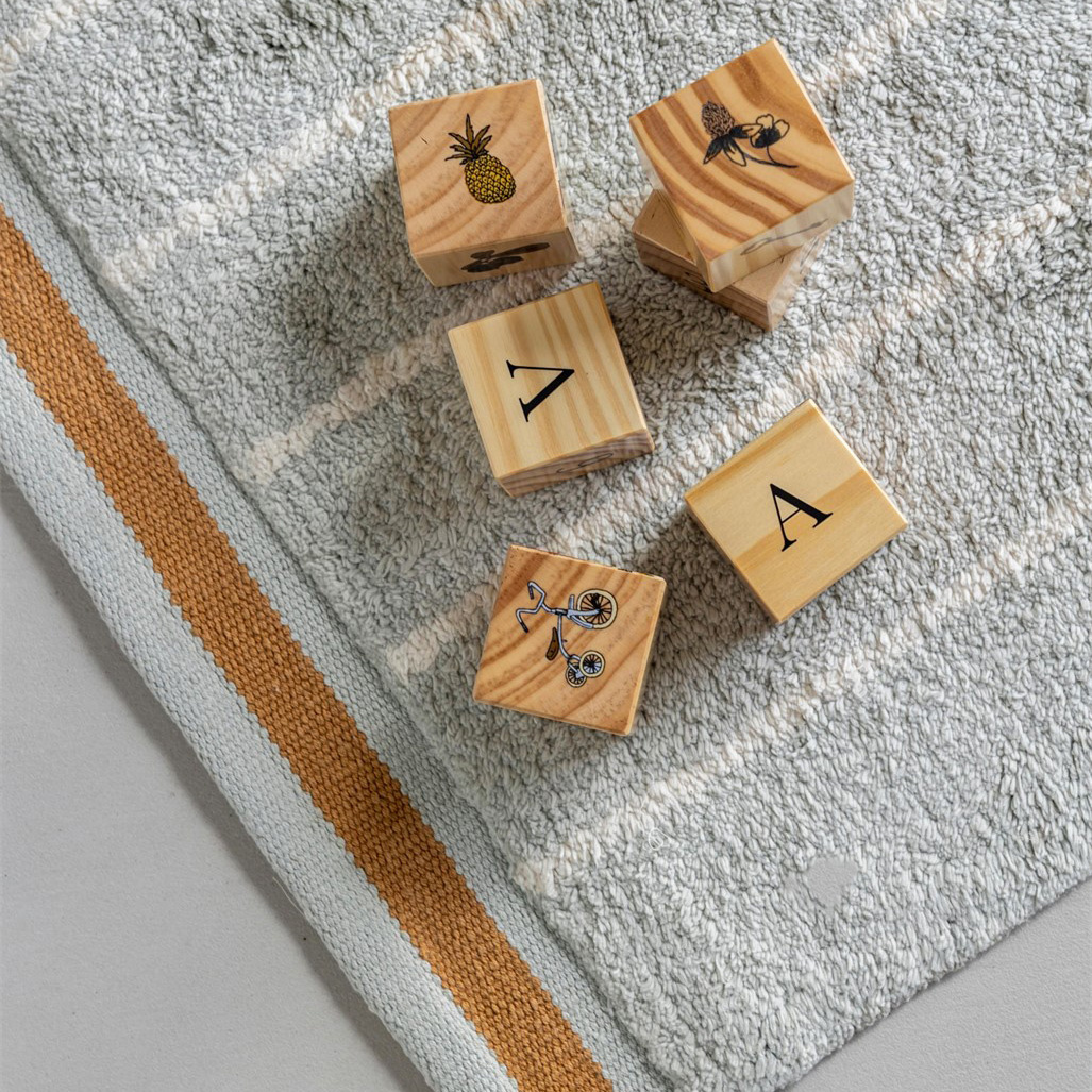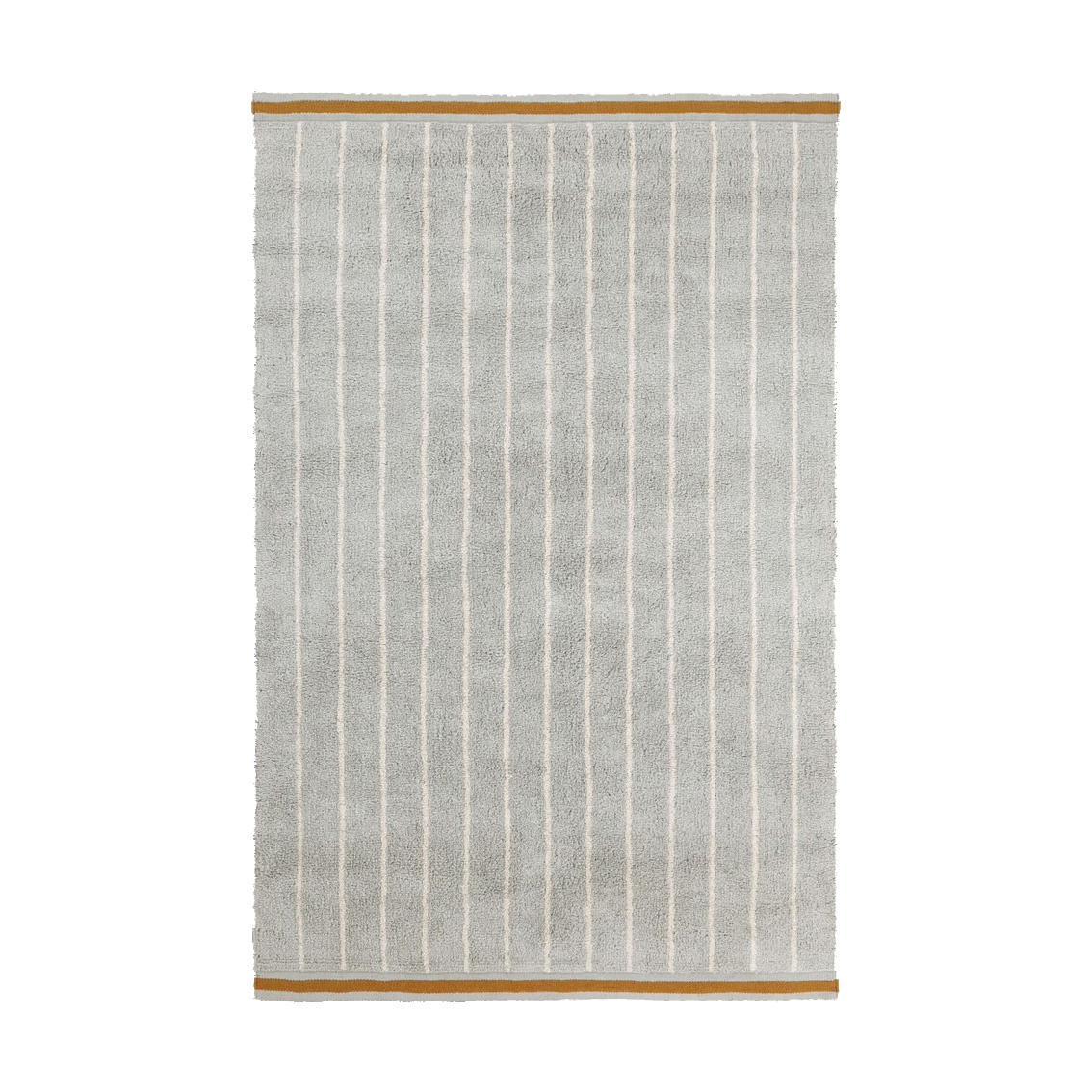 Dit mooie kindervloerkleed van Tapis Petit met strepen patroon en afgewerkt met een okergele rand en creëert een stijlvolle, warme sfeer in de kinderkamer.