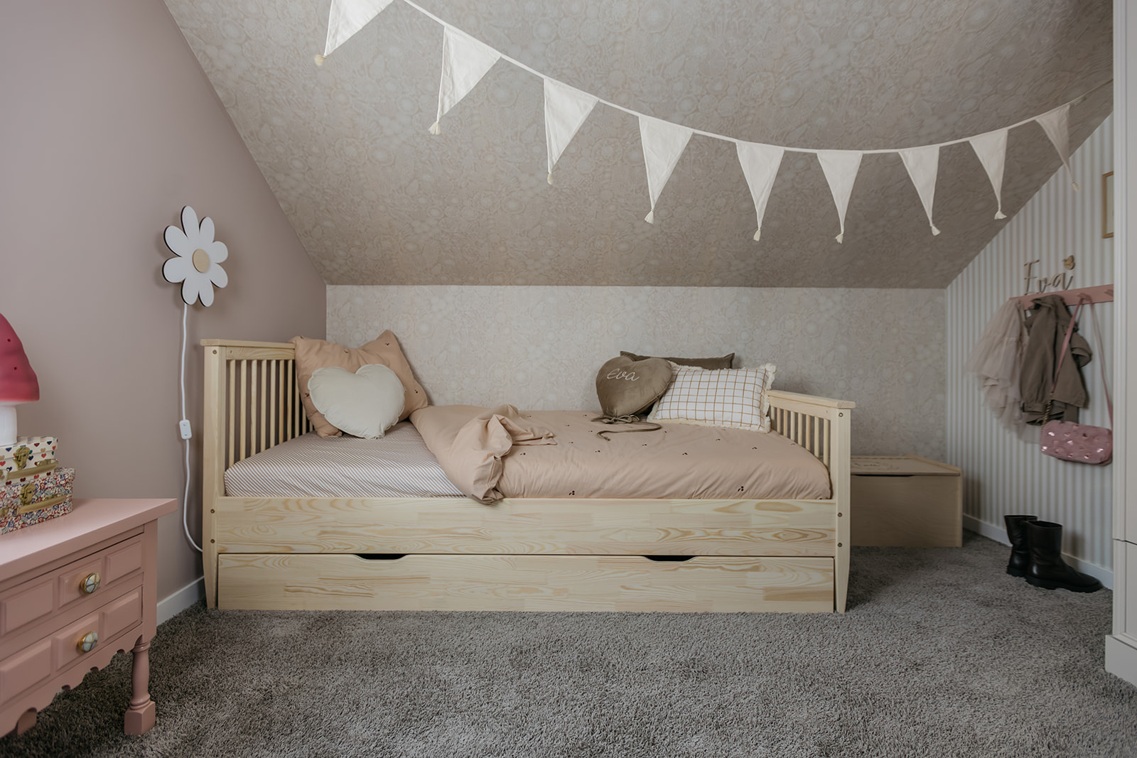 Prachtige vintage creme kleurige vlaggetjes slinger versierd met kleine kwastjes voor extra gezelligheid in de kinderkamer of als feestelijke decoratie voor een feestje.