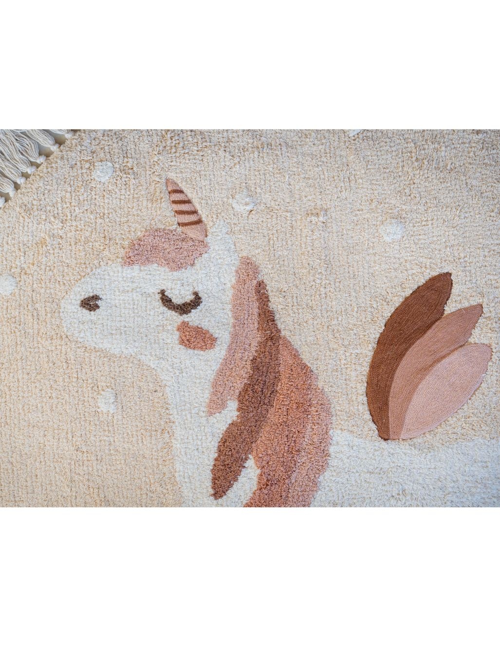 Breng een vleugje magie in de kinderkamer met dit betoverende kindervloerkleed in beige met een speels eenhoornmotief. Het ronde design in boho stijl is afgewerkt met sierlijke franjes, een echte eye-catcher voor de meidenkamer.